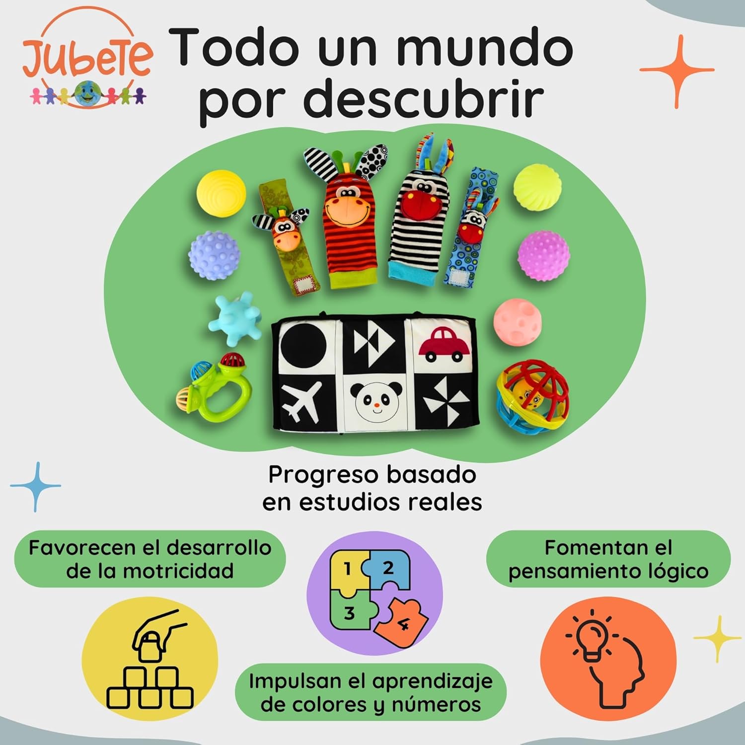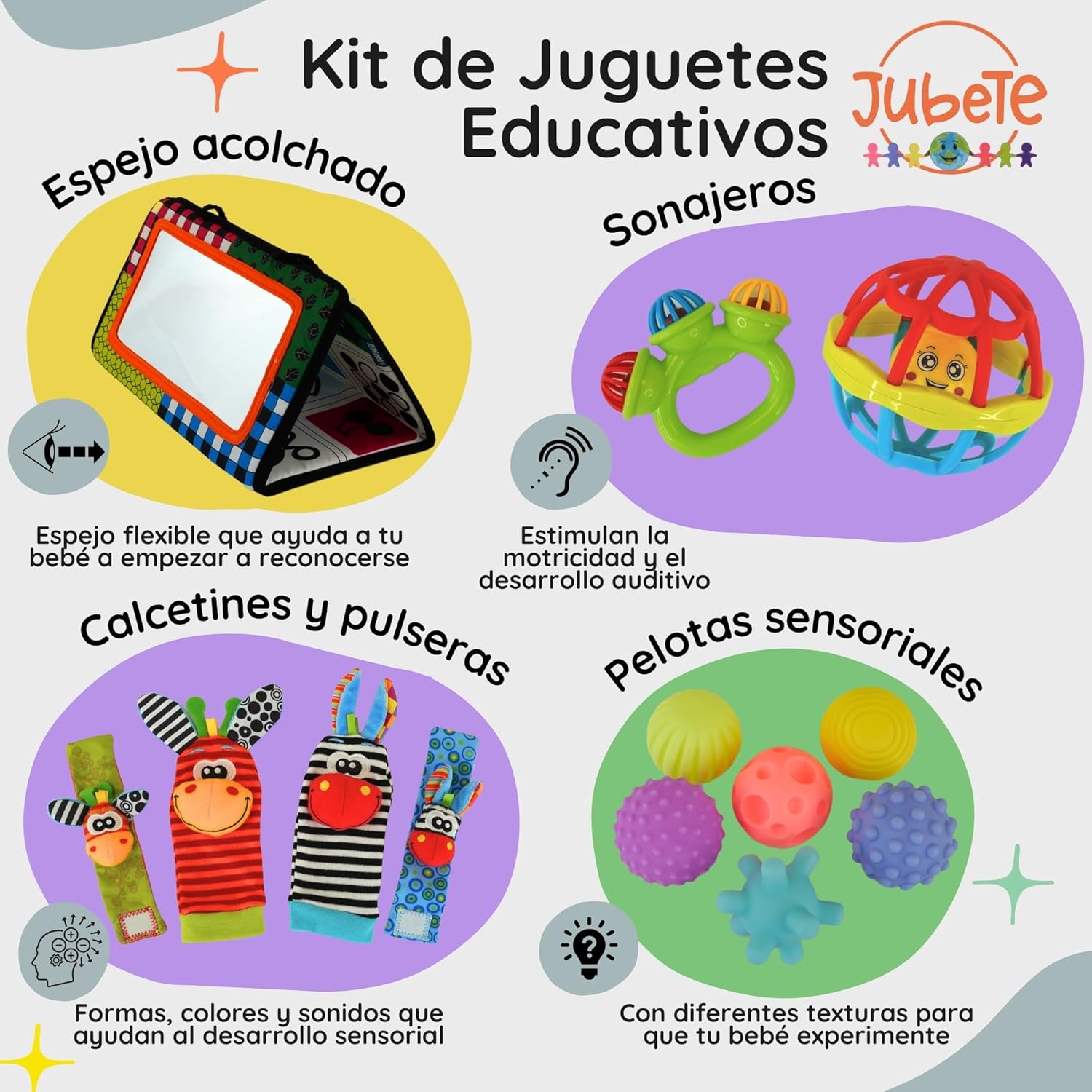 Nuestro set incluye juguetes sensoriales, espejos, distintos sonajeros y pelotas sensoriales bebé para estimular los sentidos, mejorar la coordinación mano-ojo y fomentar el descubrimiento.